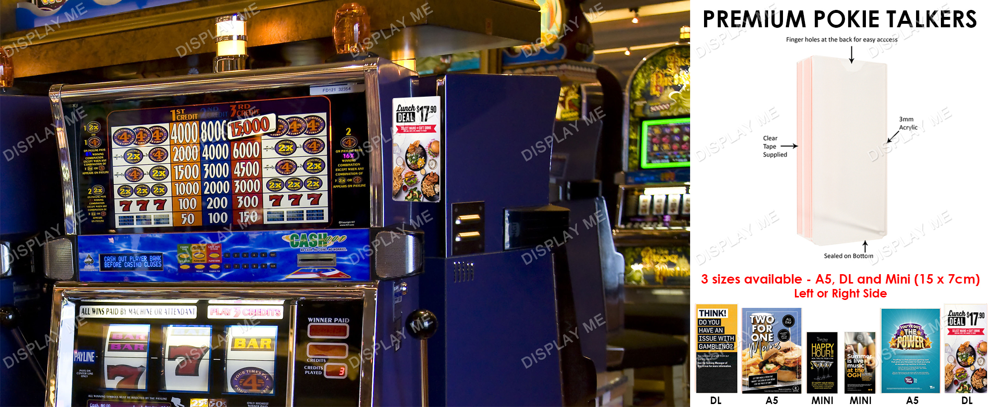 These Mini 15 x 7 cm Pokie talkers are a stylish double sided pokie machine display that are designed to be attached to the right of the pokie machines.