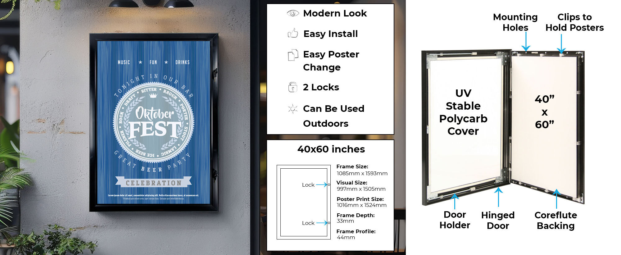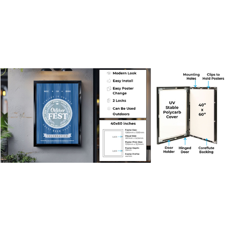 The Black 40 x 60 Inch Lockable Outdoor Showboard is a premium, professional-grade display case designed to protect and showcase your large posters both indoors and outdoors. Perfect for advertising, menus, notices, and promotional graphics, this weatherproof poster frame combines style, security, and durability for any commercial or public space.