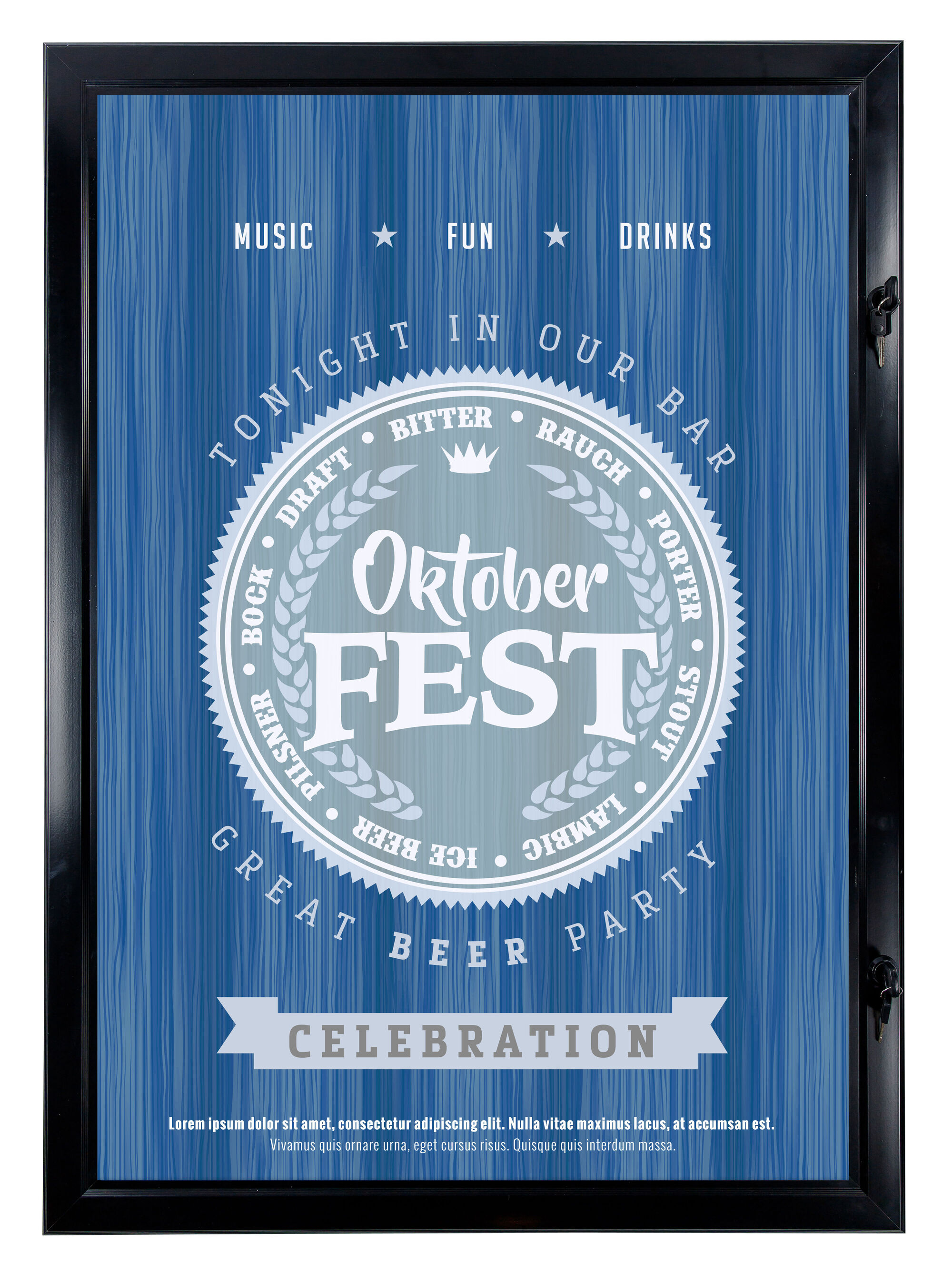 A built-in support arm keeps the door open during poster changes, making updates quick and convenient — ideal for restaurants, retail environments, schools, councils, and business premises.