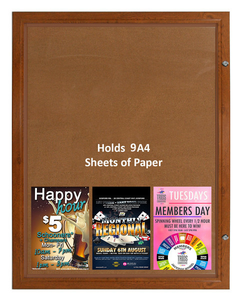 A lockable cork board is perfect for schools, strata units and companies who need to display notices or graphics prominently and want to have easy access to change their content. Suitable for outdoor use, the notice boards are fully water resistant and feature a polycarb cover to protect your graphics. The wood finish aluminum frame is very strong and robust and the lockable door will come with two sets of keys.