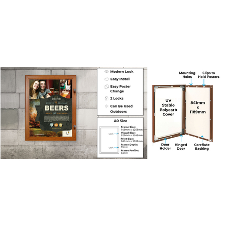 Show your posters, menus, and notices in style with the A0 Dark Wood Lockable Outdoor Showboard — perfect for restaurants, cafés, retail stores, schools, offices, and community spaces. This professional display case keeps your posters safe, highly visible, and protected from weather, fading, and tampering. Ideal for indoor or outdoor use, it combines style, security, and convenience in one sleek package.