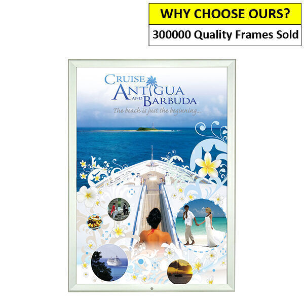 In StockThis silver square cornered A0 lockable snap frame clips open from the front and around all four sides. The clip frame system makes changing graphics easier without having to remove the frame from the wall each time. These poster frames are also called snap frames or clip frames. They can be displayed in portrait or landscape orientation and come supplied with an anti-glare cover to protect your poster and with mounting hardware. They are locked using a allen key to prevent tampering. They are ideal for advertising as well as general signage and can be used in a variety of indoor locations for a smart, professional look for your businesses signage. For outdoor use a outdoor polycarb cover must be added to the order.