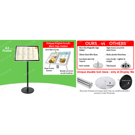 This Ezi Pole is a Black Freestanding Signholder that holds 1 A2 Black Landscape Snap Frame that is attached to a acrylic safety panel with rounded corners. Snap frames open from the front and around all four sides. This clip frame system makes changing graphics easier. It comes with a antiglare cover that protects the graphic. The base is a slim gold safety base that is 13mm thick solid metal plate covered with stainless steel which makes it very stable. The Ezi Pole is much more stable than any other similar system because it has a threaded base and a double lock to prevent it from loosening from the base.They are ideal for advertising, directories as well as general signage and promotional displays. They can be used in a variety of indoor or under cover locations for a smart, professional look for your businesses signage.