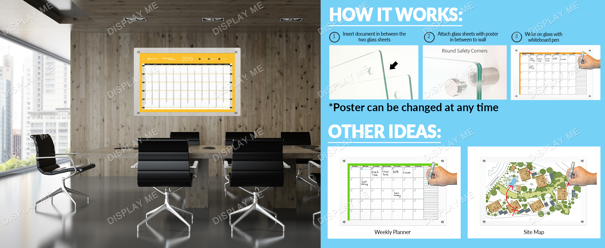 This solution is safer than side stand offs.The glass surface can be written on and easily wiped clean over and over again.