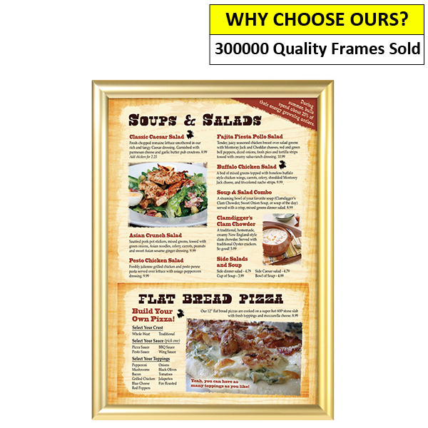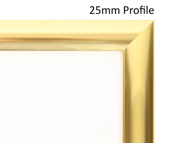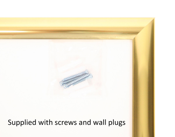 In StockThis shiny gold finish square cornered A2 snap frame clips open from the front and around all four sides. The clip frame system makes changing graphics easier without having to remove the frame from the wall each time. These poster frames are also called snap frames or clip frames. They can be displayed in portrait or landscape orientation and come supplied with an anti-glare cover to protect your poster and with mounting hardware. They are ideal for advertising as well as general signage and can be used in a variety of indoor locations for a smart, professional look for your businesses signage.
