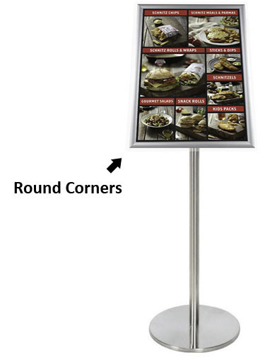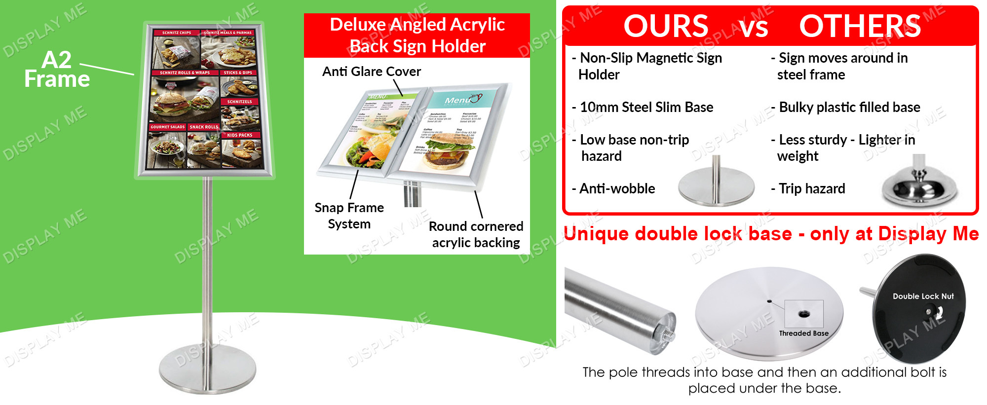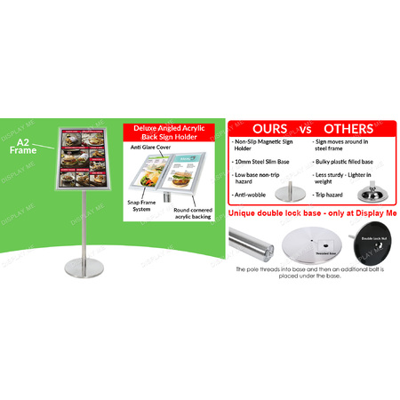 This Ezi Pole is a Freestanding Signholder that holds 1 A2 Portrait Snap Frame that is attached to a acrylic safety panel panel with rounded corners. Snap frames open from the front and around all four sides. This clip frame system makes changing graphics easier. It comes with a antiglare cover that protects the graphic. The base is a slim safety base that is 13mm thick solid metal plate covered with stainless steel which makes it very stable. The Ezi Pole is much more stable than any other similar system because it has a threaded base and a double lock to prevent it from loosening from the base.They are ideal for advertising, directories as well as general signage and promotional displays. They can be used in a variety of indoor or under cover locations for a smart, professional look for your businesses signage.