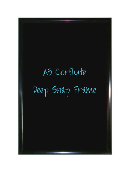 This A3 Black Corflute Deep snap frame clips open from the front and around all four sides. The clip frame system makes changing graphics easier without having to remove the frame from the wall each time. These poster frames are also called snap frames or clip frames. They can be displayed in portrait or landscape orientation and come supplied with mounting hardware.