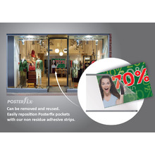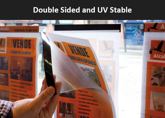 This A3 Clear Display with Black Border Landscape PosterFix® Window Sign Display is a easy to use and fast to install economical way to display posters, signs and notices. It easily affixes with a removable and reusable adhesive that easily peels off and can be moved to almost any flat surface. They are ideal for displaying two documents in a Window Shopfront or Glass Door, so the information can be seen on both sides. It is made from a 700 micron flexible UV stable Anti-glare PVC. PosterFix® is a high end durable European made quality product.