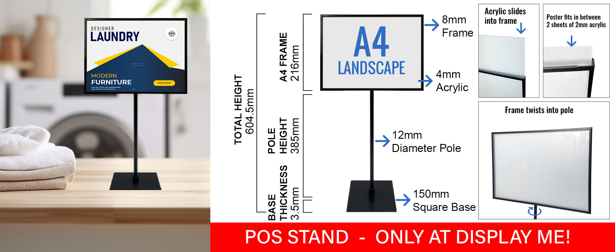 This POS Stand is ideal for displaying posters and information in a retail or fast paced environments such as furniture and appliance stores retail stores, supermarkets, department stores, car dealerships, cafes, newsagents, waiting rooms.