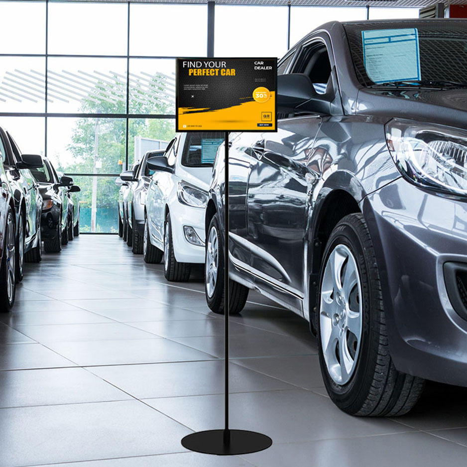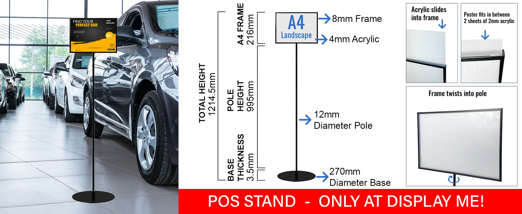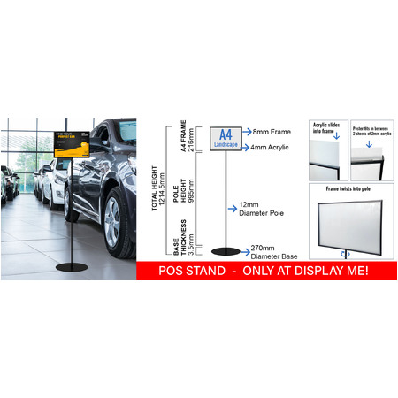 This POS Stand is ideal for displaying posters and information in a retail or fast paced environments such as furniture and appliance stores retail stores, supermarkets, department stores, car dealerships, cafes, newsagents, waiting rooms.