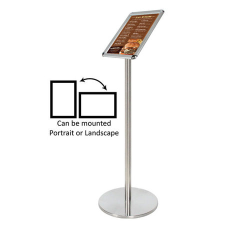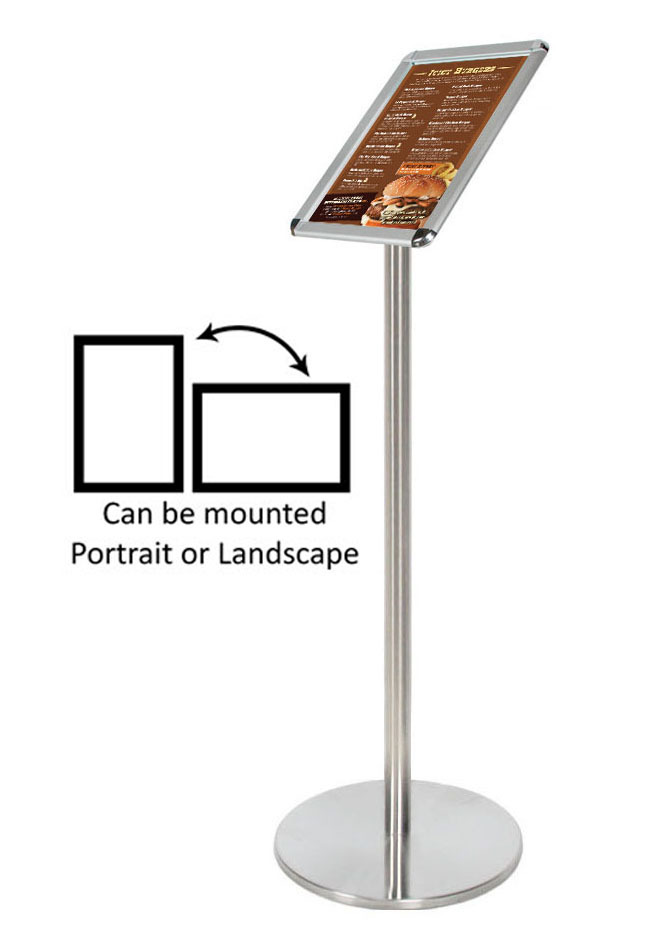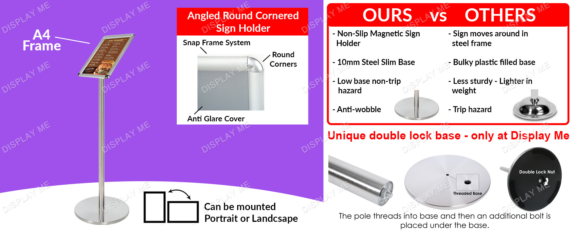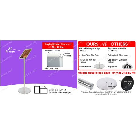The A4 Angled Silver QR Stand is a type of display stand or holder designed to hold an printed A4 sized Quick Response (QR Code). It has an angled design, which allows the document or paper to be displayed at an angle that makes it easier to read or view. The QR Stand has a Silver Round Cornered Snap Frame Snap frames open from the front and around all four sides. This clip frame system makes changing graphics easier. It comes with a antiglare cover that protects the graphic. The base is a slim safety base that is 13mm thick and has a solid metal plate covered with stainless steel which makes it very stable. The Ezi Pole is much more stable than any other similar system because it has a threaded base and a double lock to prevent it from loosening from the base.They are ideal for advertising, directories as well as general signage and promotional displays. They can be used in a variety of indoor or under cover locations for a smart, professional look for your businesses signage.