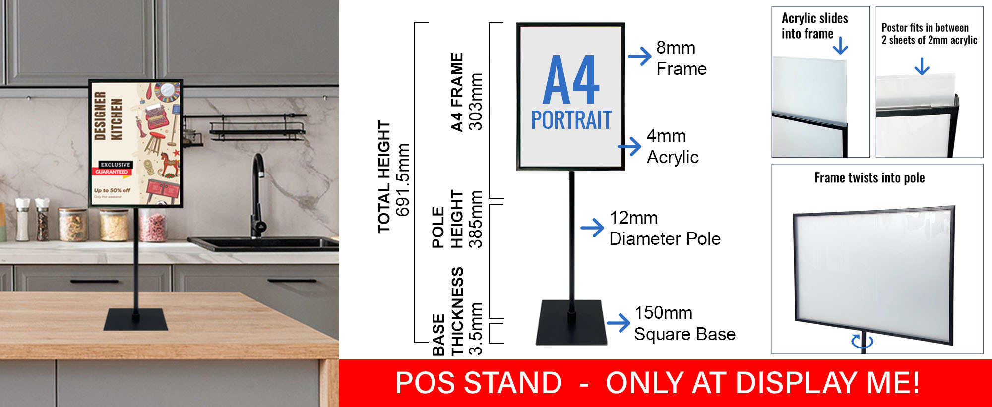 This POS Stand is ideal for displaying posters and information in a retail or fast paced environments such as furniture and appliance stores retail stores, supermarkets, department stores, car dealerships, cafes, newsagents, waiting rooms.