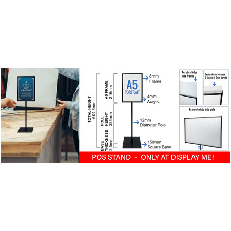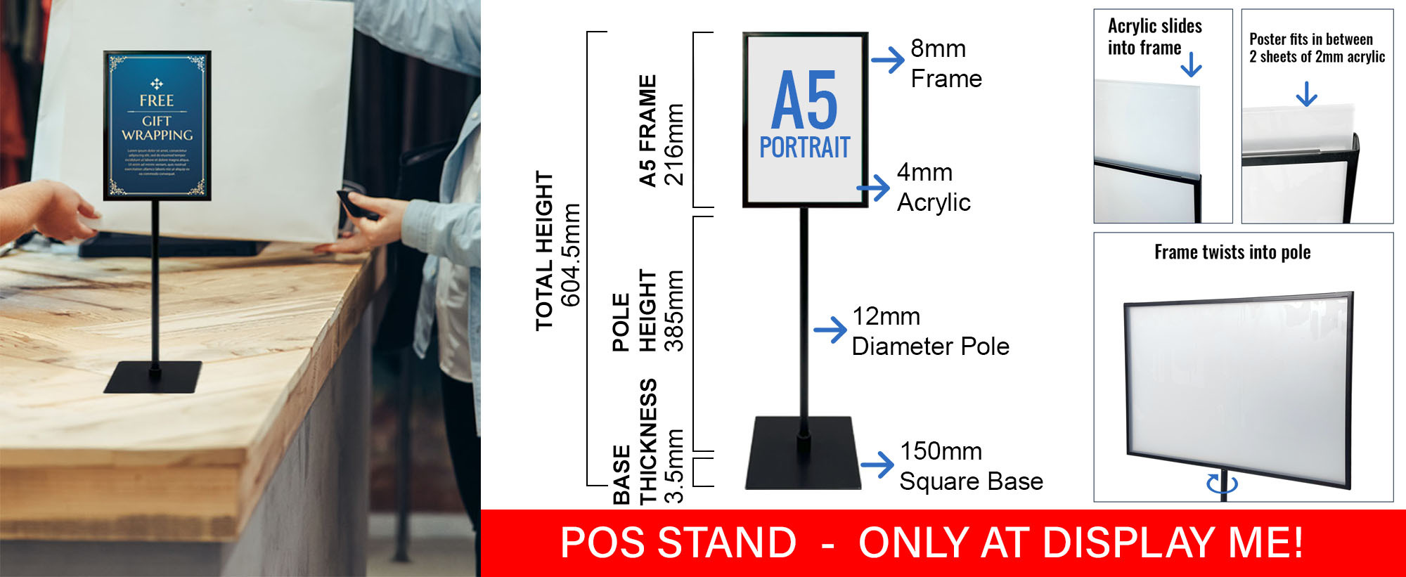 This POS Stand is ideal for displaying posters and information in a retail or fast paced environments such as furniture and appliance stores retail stores, supermarkets, department stores, car dealerships, cafes, newsagents, waiting rooms.