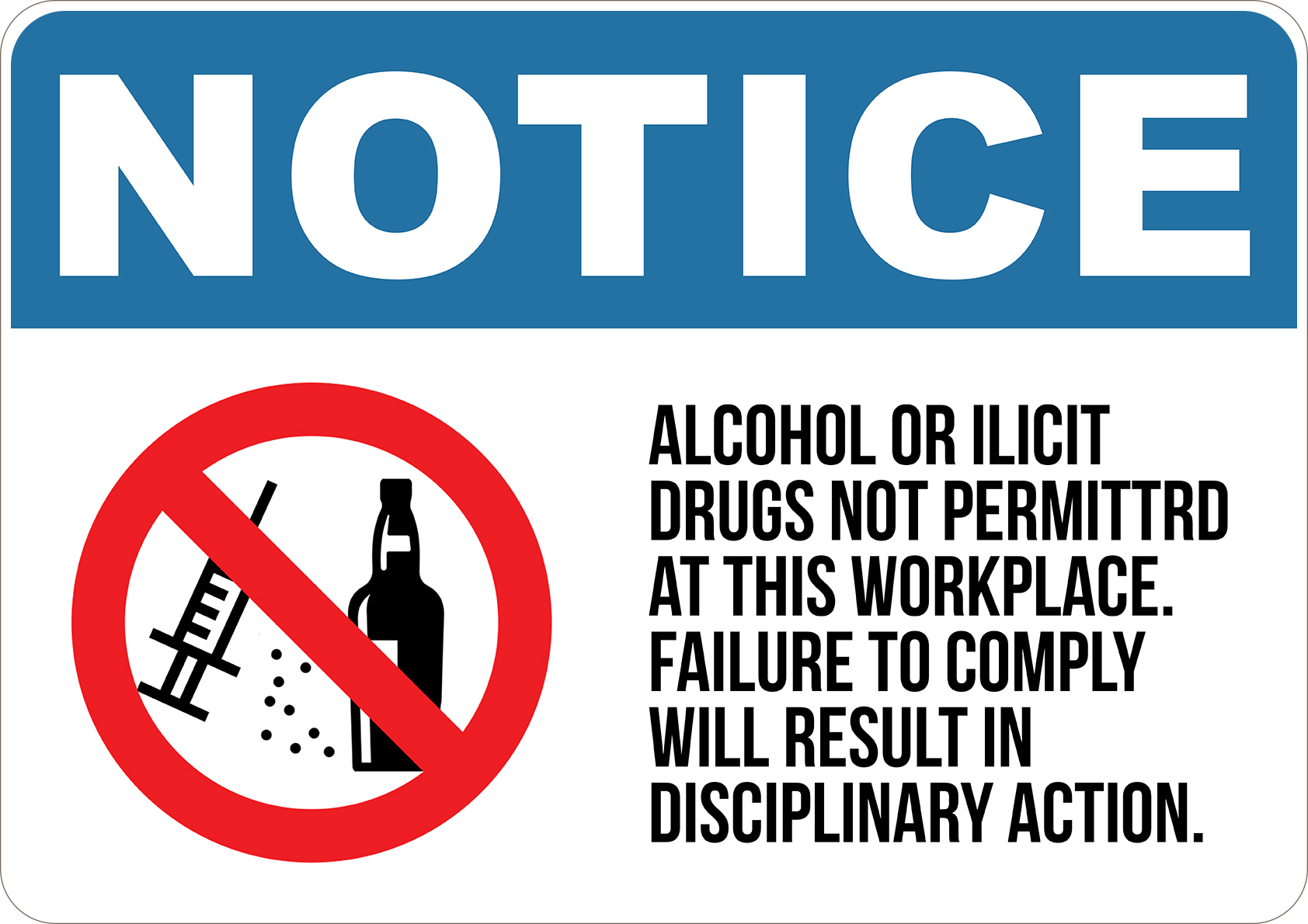 PRINTED ALUMINUM A5 SIGN - Alcohol or Ilicit Drugs No Permitted at the Workplace. Failure to Comply will Result in Disciplinary Action Sign