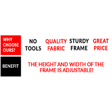 The black lightweight tubular aluminium frame is easy to assemble and takes 5 min to assemble with no tools required. Frame connects and is secured in place using a telescopic system.