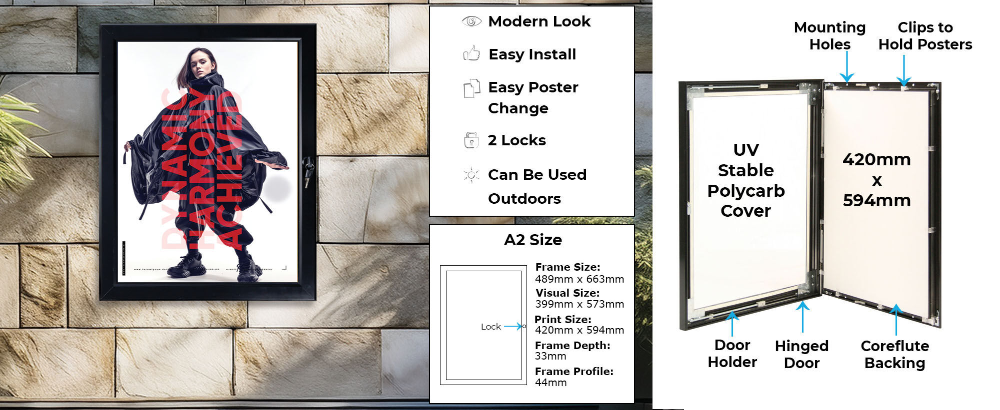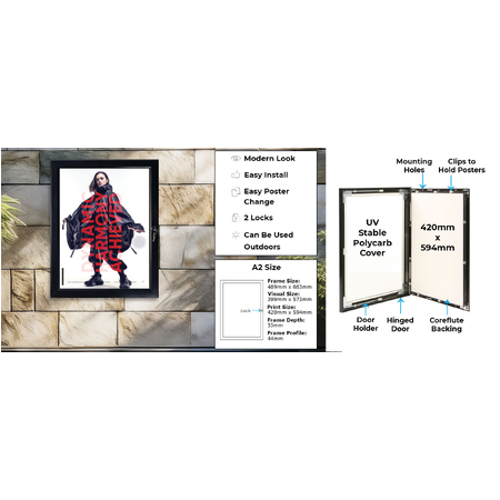 Crafted from high-quality aluminium with a black powder-coated finish, this A2 display frame features a lockable hinged door to safeguard your content against tampering, rain, and sun exposure. The UV-stable, impact-resistant polycarbonate cover offers clear visibility while ensuring long-lasting protection from the elements.