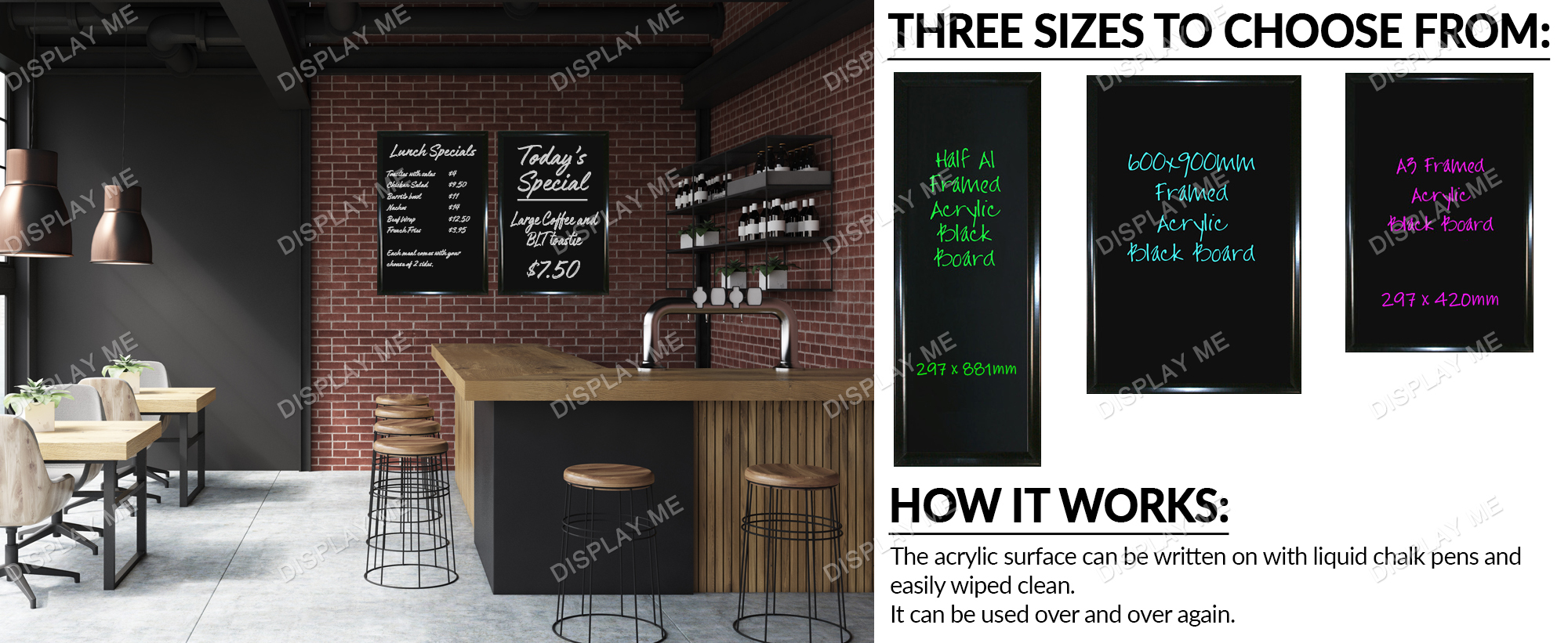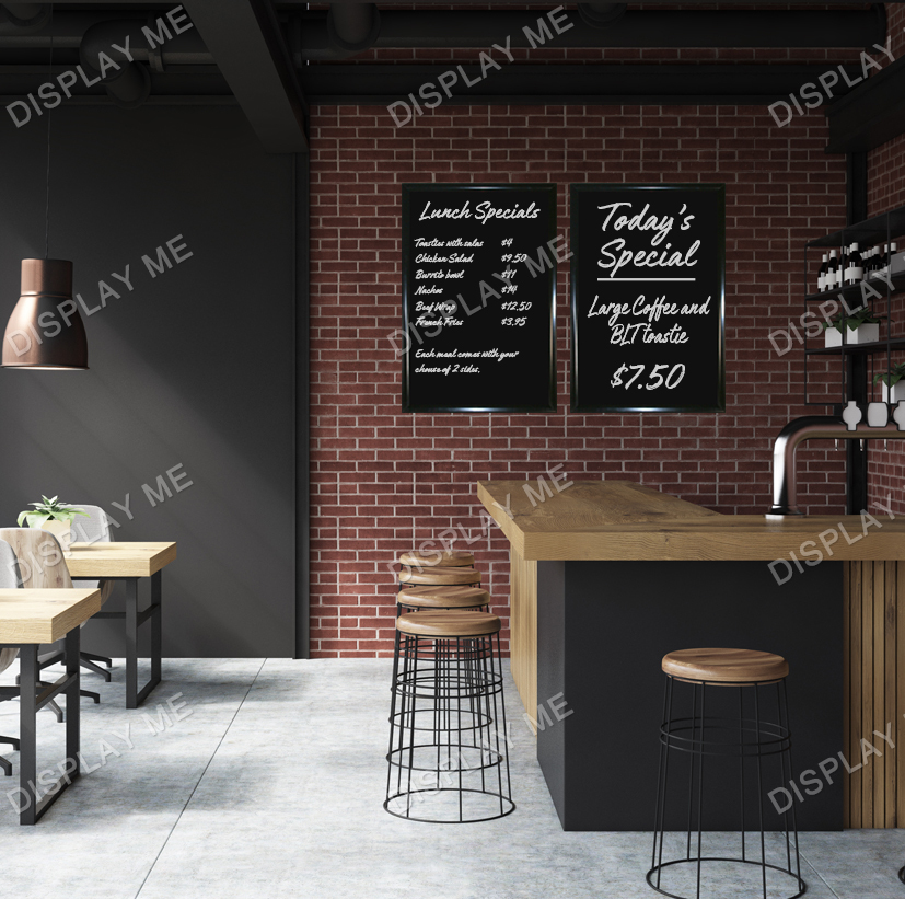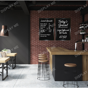 These Framed A3 Menu Blackboards are made of 3mm thick acrylic and are framed with a stylish black snap frame giving it a modern contemporary look that can be used in a variety of cafes, restaurants, clubs, bars or anywhere where a menu or blackboard can be used. The acrylic surface can be written on with liquid chalk pen and easily wiped clean. It can be used over and over again.