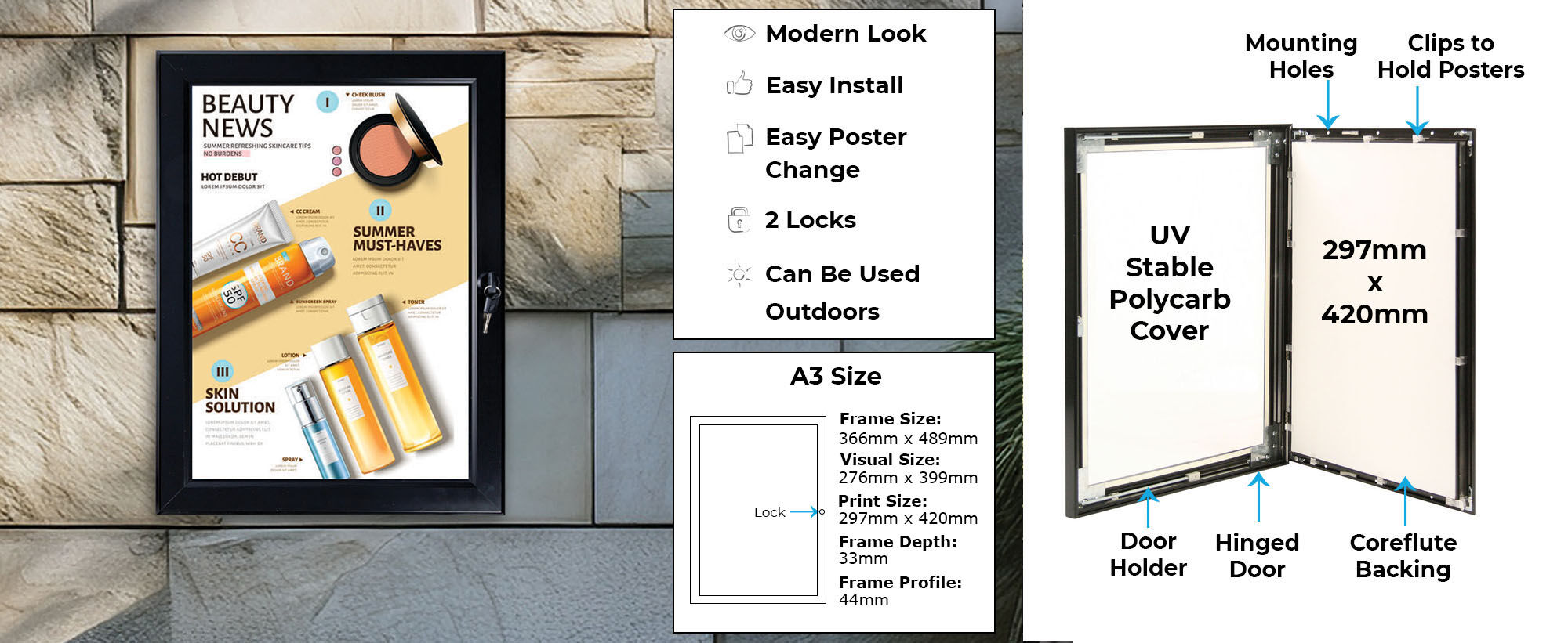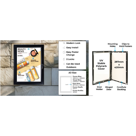 Built from black anodised aluminium, this frame offers a sleek, modern finish while providing long-term resistance to weather and corrosion. The lockable hinged door keeps your content safe from tampering, while the UV-stable, impact-resistant polycarbonate cover protects against sun, rain, and vandalism.