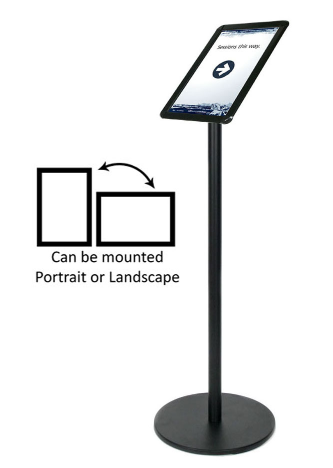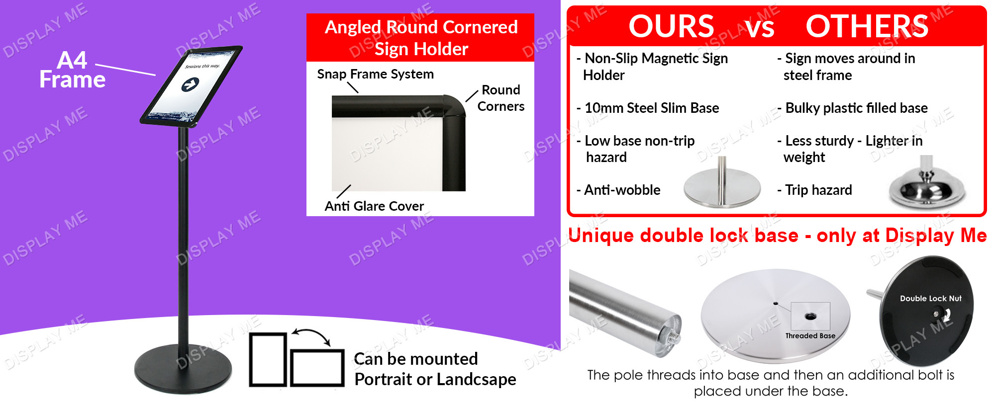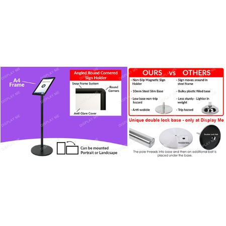 The A4 Angled Black QR Stand is a type of display stand or holder designed to hold an printed A4 sized Quick Response (QR Code). It has an angled design, which allows the document or paper to be displayed at an angle that makes it easier to read or view. The QR Stand has a Snap frame that open from the front and around all four sides. This clip frame system makes changing graphics easier. It comes with a antiglare cover that protects the graphic. The base is a slim black powder coated safety base that is 13mm thick and has a solid metal plate covered with stainless steel which makes it very stable. The Ezi Pole is much more stable than any other similar system because it has a threaded base and a double lock to prevent it from loosening from the base.They are ideal for advertising, directories as well as general signage and promotional displays. They can be used in a variety of indoor or under cover locations for a smart, professional look for your businesses signage.