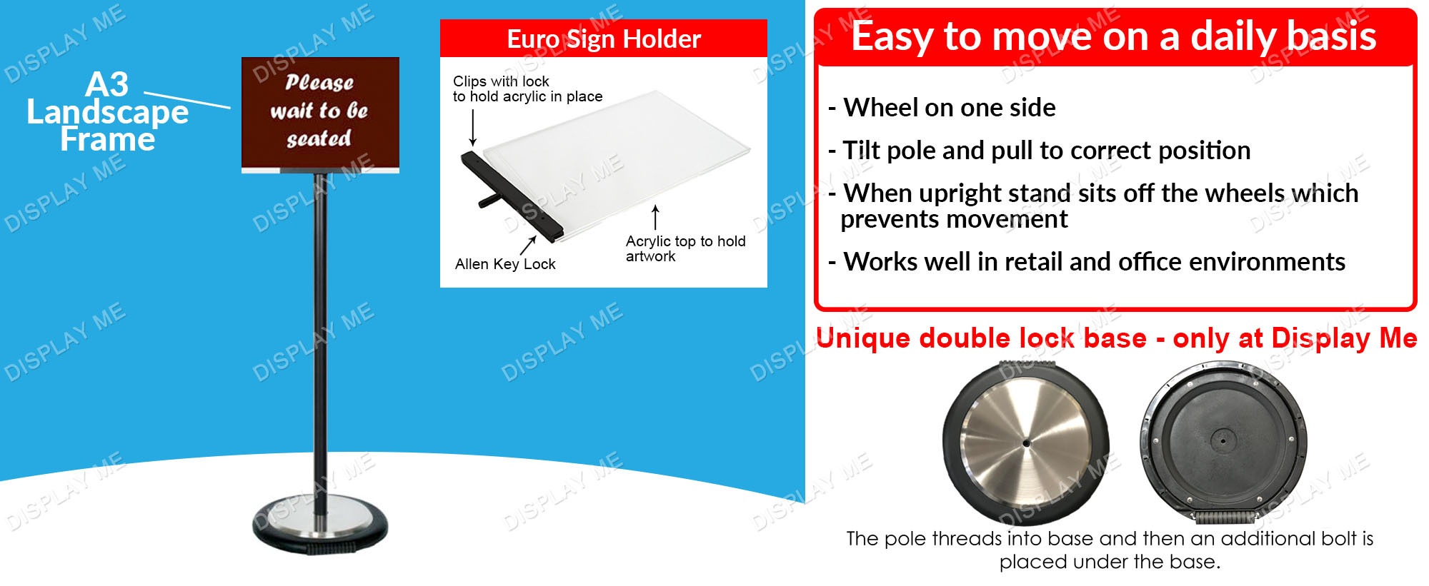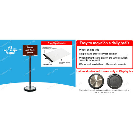 This Ezi Pole is a Black freestanding vertical stainless steel sign holder that has a Euro Clip on it. This Clip holds a A3 Landscape sign. The Euro Clip is a clip that holds together a piece of Acrylic that is holding the graphic. The Acrylic 3mm thick high quality acrylic has a crystal clear transparency. The base is a base that is 35mm thick with a wheel on one side to make moving easier and has a solid base covered with stainless steel which makes it very stable. They are ideal for advertising, directories as well as general signage and promotional displays. They can be used in a variety of indoor or under cover locations for a smart, professional look for your businesses signage.