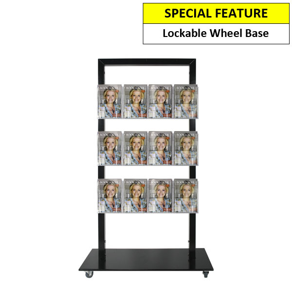 In StockThe Mall Stand is a portable display stand. This is a Single Sided black freestanding stand with a Snap Header and 12 A5 Brochure Holders. It is sturdy and made of Steel and powder Coated in Black. It is 143cm high which enables you to easily look over it to see beyond the line of sight. The frame is a tamper proof snap frame with a steel backing. The frame remains locked unless bottom, sides then top profiles are opened sequentially. The Acrylic Brochure holders are scratch resistant and have a glass like appearance. The base is a low profile lockable wheel base that has removable wheels. They are ideal for venues and shopping malls to advertise or promote events. They can be used in a variety of indoor or under cover locations for a smart, professional look for your businesses signage and promotions.