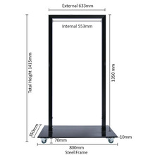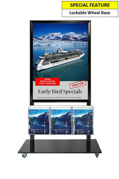 In StockThe Mall Stand is a portable display stand. This is a Double Sided black freestanding stand with A1Snap Frame and 3 A4 Brochure Holders on both sides. It is sturdy and made of Steel and powder Coated in Black. It is 143cm high which enables you to easily look over it to see beyond the line of sight. The frame is a tamper proof snap frame with a steel backing. The frame remains locked unless bottom, sides then top profiles are opened sequentially. The Acrylic Brochure holders are scratch resistant and have a glass like appearance. The base is a low profile lockable wheel base that has removable wheels. They are ideal for venues and shopping malls to advertise or promote events. They can be used in a variety of indoor or under cover locations for a smart, professional look for your businesses signage and promotions.