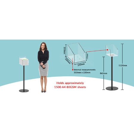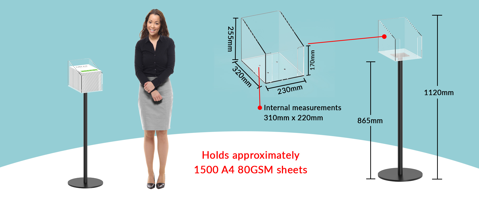 This A4 freestanding Promo Holder has 3mm thick clear Acrylic top clearly displaying the contents of the deep catalogue holder. This A4 pamphlet floor stand can hold A4 (210 x 297mm) literature in Portrait format.