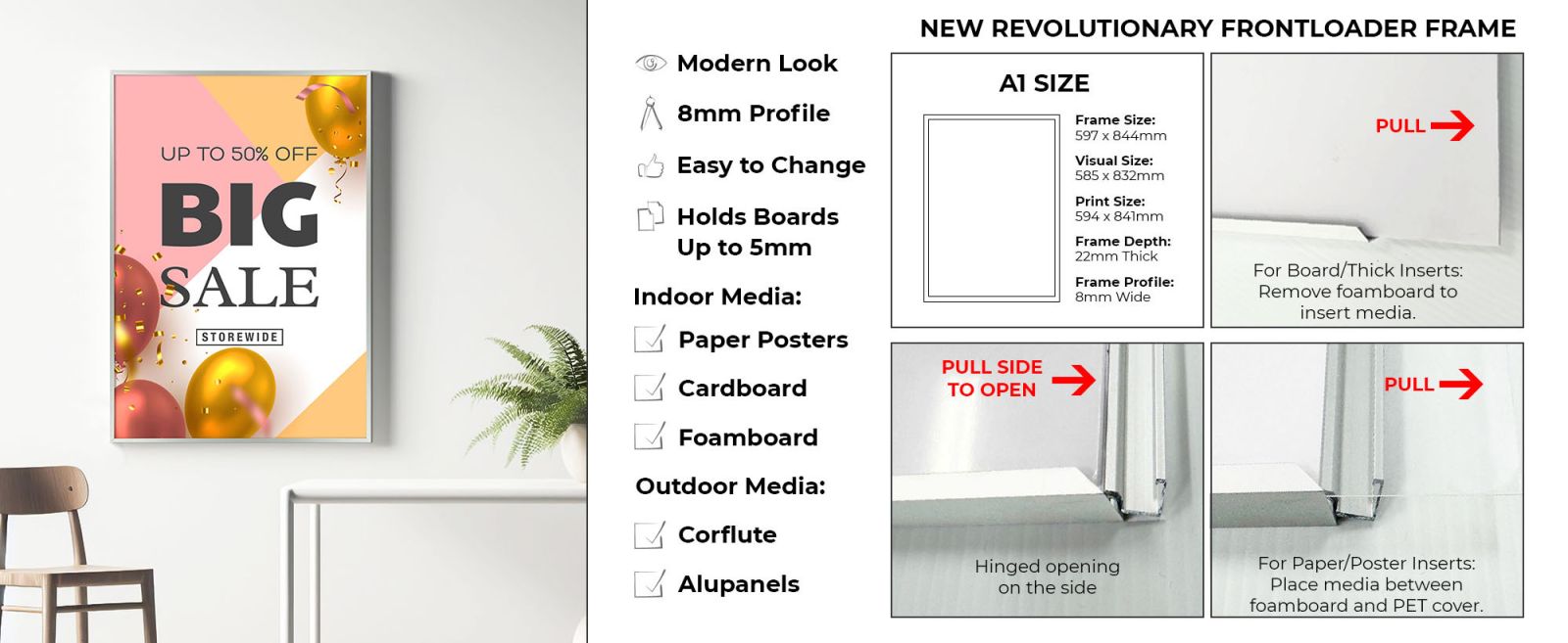 Display your signage in style with this bulk pack of 10 A1 Front Loader Poster Frames. Designed for professional and versatile use, these sleek aluminium frames feature a side-loading mechanism for quick and easy poster changes, no tools needed. Perfect for retail stores, offices, schools, and healthcare facilities, they provide a clean, modern look for any environment.
