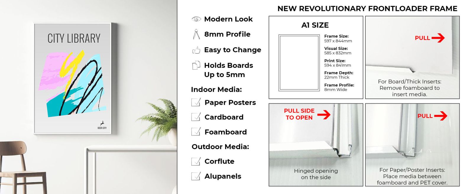 Each frame holds A1 inserts up to 5 mm thick and includes a clear PET protective cover. Suitable for indoor and outdoor applications (when used with waterproof inserts such as corflute or alupanel). All mounting accessories are included.