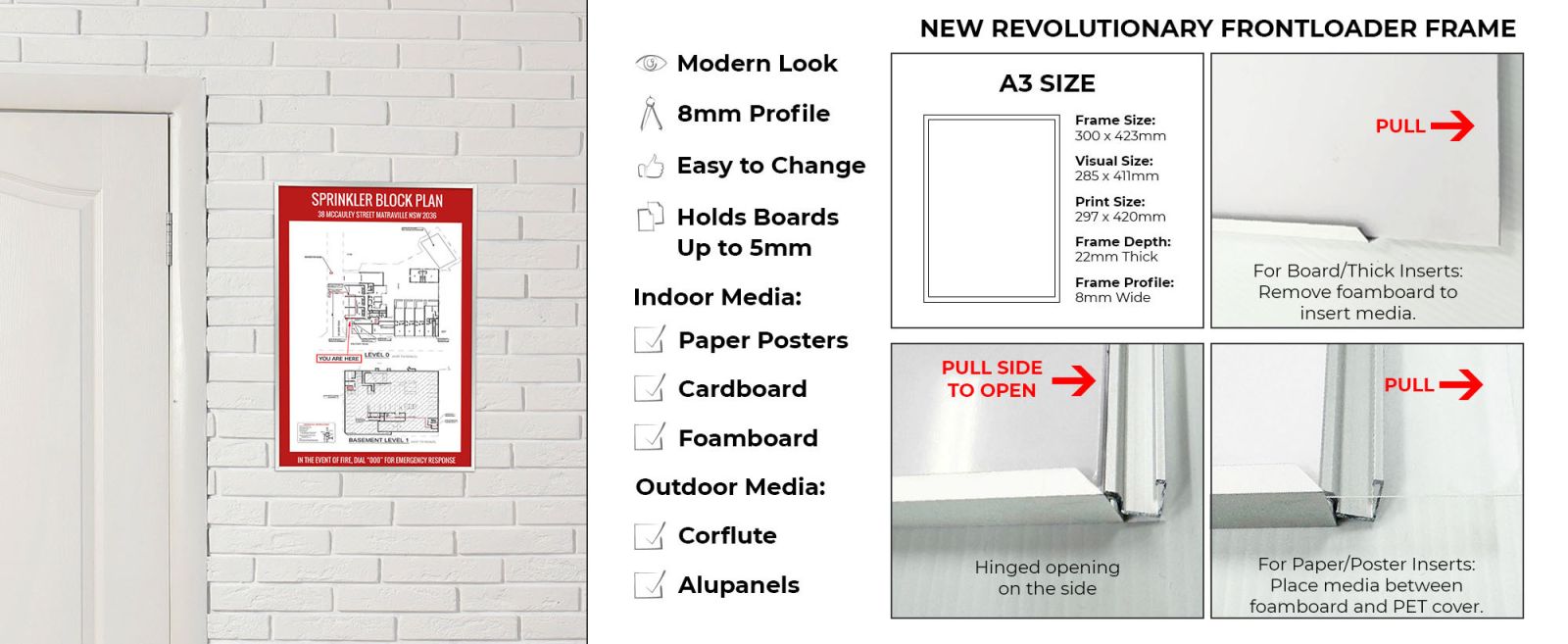 Each frame holds inserts up to 5 mm thick and includes a clear PET protective cover. Suitable for indoor and outdoor applications (when used with waterproof inserts like corflute or alupanel). All mounting accessories are included.