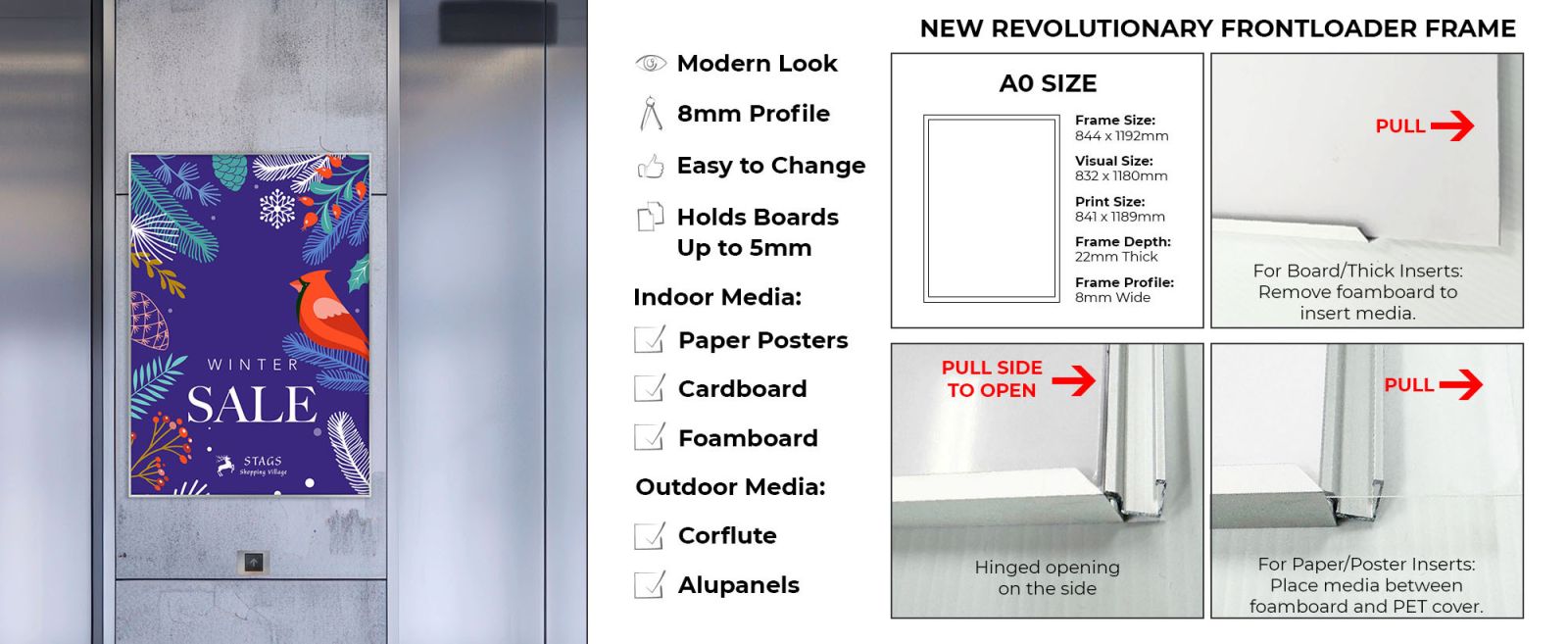 Display your signage in style with this bulk pack of 5 Front Loader Poster Frames. Designed for professional and versatile use, these sleek aluminium frames feature a side-loading mechanism for quick and easy poster changes no tools needed. Perfect for retail stores, offices, schools, and healthcare facilities, they provide a clean, modern look for any environment.
