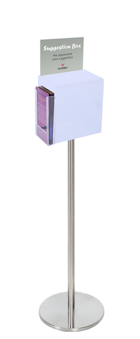 Premium Frosted Suggestion Box with A5 Display on Silver Pole and Base with DL Brochure Holder on Side