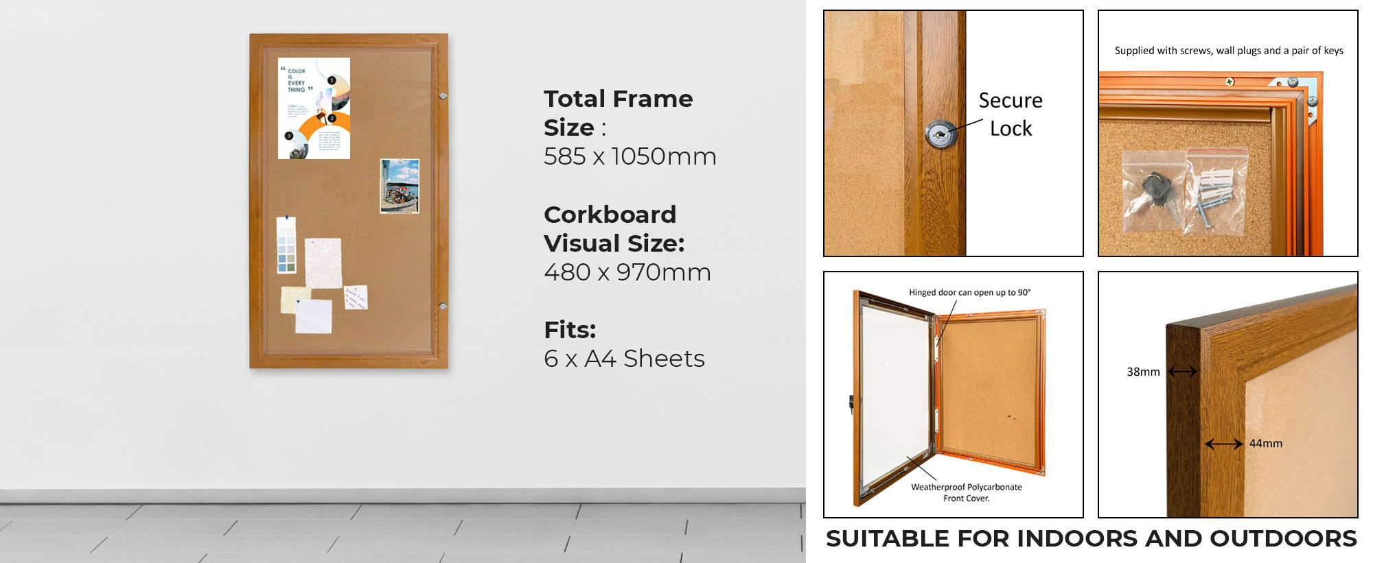 With space to hold 6 x A4 sheets or 3 x A3 sheets, this corkboard is perfect for announcements, safety information, timetables, community notices, and promotional displays. It can be installed in portrait or landscape orientation, making it versatile for a wide range of wall spaces.