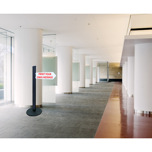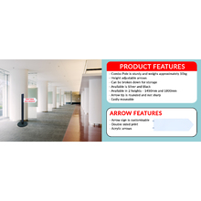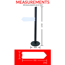 These portable freestanding directional signs are placed on a black 1450mm aluminium powder coated pole. The heavy base comes with a heavy plate giving it extra stability. It has a rubber surface to avoid scratching the floors.
