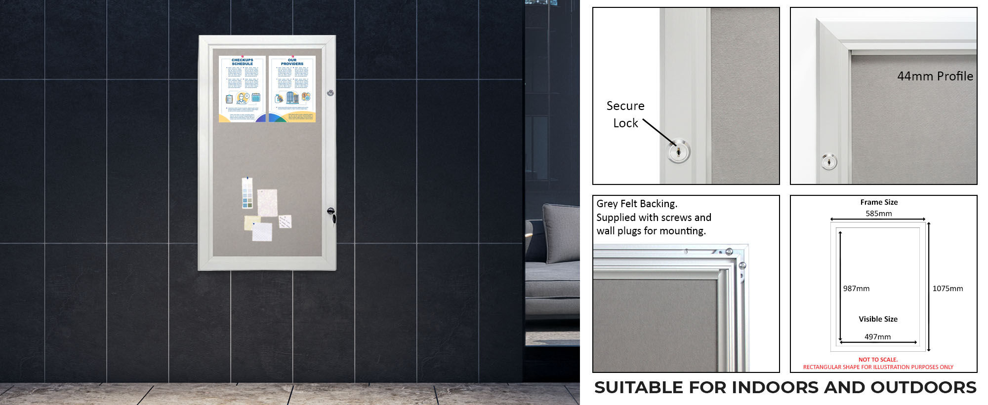This notice board is rain-resistant, not waterproof. While it is outdoor-rated and suitable for use in sheltered outdoor areas, heavy or prolonged rainfall, flooding, water immersion, or extreme weather may cause moisture ingress and damage to the felt backing or internal components.