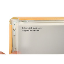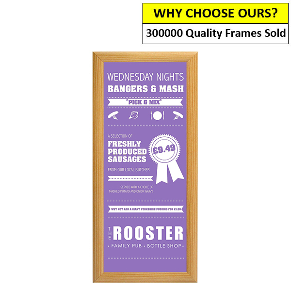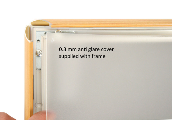 In StockThis light wood finish square cornered Half A1 snap frame clips open from the front and around all four sides. The clip frame system makes changing graphics easier without having to remove the frame from the wall each time. These poster frames are also called snap frames or clip frames. They can be displayed in portrait or landscape orientation and come supplied with an anti-glare cover to protect your poster and with mounting hardware. They are ideal for advertising as well as general signage and can be used in a variety of indoor locations for a smart, professional look for your businesses signage.