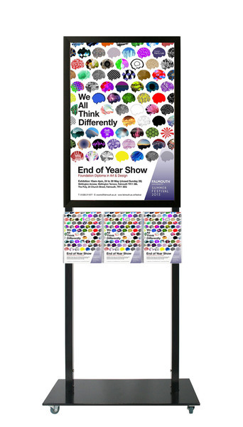 In StockThe Tall Info Stand is a portable display stand. This is a Single Sided black freestanding stand with a A1 Poster Display and 3 A4 Brochure Holders. It is sturdy and made of Steel and powder coated in Black. This stand is 1800mm tall and stands out making it visible and prominent. The frame is a tamper proof snap frame with a steel backing. The frame remains locked unless bottom, sides then top profiles are opened sequentially. The base is a low profile lockable wheel base that has removable wheels. They are ideal for venues and shopping malls to advertise or promote events. They can be used in a variety of indoor or under cover locations for a smart, professional look for your businesses signage and promotions.
