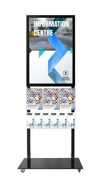 In StockThe Tall Info Stand is a portable display stand. This is a Double Sided freestanding stand with a A1 Poster Display and 3 A4 and 6 DL Brochure Holders on each side. It is sturdy and made of Steel and powder coated in Black. This stand is 1800mm tall and stands out making it visible and prominent. The frame is a tamper proof snap frame with a steel backing. The frame remains locked unless bottom, sides then top profiles are opened sequentially. The base is a low profile lockable wheel base that has removable wheels. They are ideal for venues and shopping malls to advertise or promote events. They can be used in a variety of indoor or under cover locations for a smart, professional look for your businesses signage and promotions.