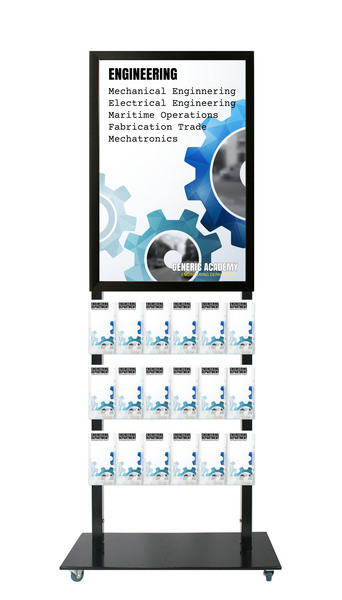 In StockThe Tall Info Stand is a portable display stand. This is a Single Sided black freestanding stand with a A1 Poster Display and 18 DL Brochure Holders. It is sturdy and made of Steel and powder coated in Black. This stand is 1800mm tall and stands out making it visible and prominent. The frame is a tamper proof snap frame with a steel backing. The frame remains locked unless bottom, sides then top profiles are opened sequentially. The base is a low profile lockable wheel base that has removable wheels. They are ideal for venues and shopping malls to advertise or promote events. They can be used in a variety of indoor or under cover locations for a smart, professional look for your businesses signage and promotions.