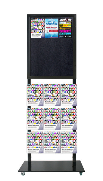 In StockThis Lockable Black Freestanding Felt Tall Info Stand is a portable display stand. This Freestanding Lockable Notice board has a Felt notice board that holds 6 A4 Sheets of paper and 9 A4 Brochure Holders. It is sturdy and made of Steel and powder coated in Black. This stand is 1800mm tall and stands out making it visible and prominent. The frame is a tamper proof snap frame with a steel backing. The frame remains locked unless bottom, sides then top profiles are opened sequentially. The base is a low profile lockable wheel base that has removable wheels. They are ideal for venues and shopping malls to advertise or promote events. They can be used in a variety of indoor or under cover locations for a smart, professional look for your businesses signage and promotions. Please Note: This product is ideal for indoor and undercover use.