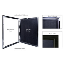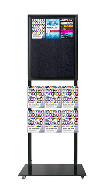 In StockThis Double Sided Lockable Black Freestanding Felt Tall Info Stand is a portable display stand. This Freestanding Lockable Notice board has a Felt notice board that holds 6 A4 Sheets of paper and 6 A4 Brochure Holders on both sides. It is sturdy and made of Steel and powder coated in Black. This stand is 1800mm tall and stands out making it visible and prominent. The frame is a tamper proof snap frame with a steel backing. The frame remains locked unless bottom, sides then top profiles are opened sequentially. The base is a low profile lockable wheel base that has removable wheels. They are ideal for venues and shopping malls to advertise or promote events. They can be used in a variety of indoor or under cover locations for a smart, professional look for your businesses signage and promotions.
