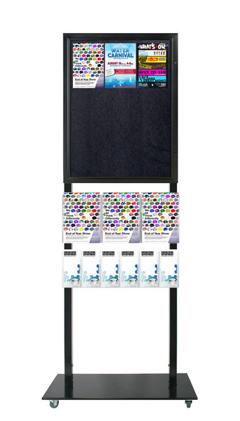In StockThis Double Sided Lockable Black Freestanding Felt Tall Info Stand is a portable display stand. This Freestanding Lockable Notice board has a Felt notice board that holds 6 A4 Sheets of paper and 3 A4 and 6 DL Brochure Holders on both sides. It is sturdy and made of Steel and powder coated in Black. This stand is 1800mm tall and stands out making it visible and prominent. The frame is a tamper proof snap frame with a steel backing. The frame remains locked unless bottom, sides then top profiles are opened sequentially. The base is a low profile lockable wheel base that has removable wheels. They are ideal for venues and shopping malls to advertise or promote events. They can be used in a variety of indoor or under cover locations for a smart, professional look for your businesses signage and promotions.