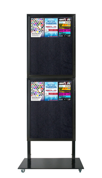 In StockThis Lockable Black Freestanding Felt Tall Info Stand is a portable display stand. This Freestanding Lockable Notice board has two boards that holds 6 A4 Sheets of paper. It is sturdy and made of Steel and powder coated in Black. This stand is 1800mm tall and stands out making it visible and prominent. The frame is a tamper proof snap frame with a steel backing. The frame remains locked unless bottom, sides then top profiles are opened sequentially. The base is a low profile lockable wheel base that has removable wheels. They are ideal for venues and shopping malls to advertise or promote events. They can be used in a variety of indoor or under cover locations for a smart, professional look for your businesses signage and promotions.