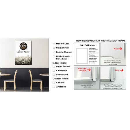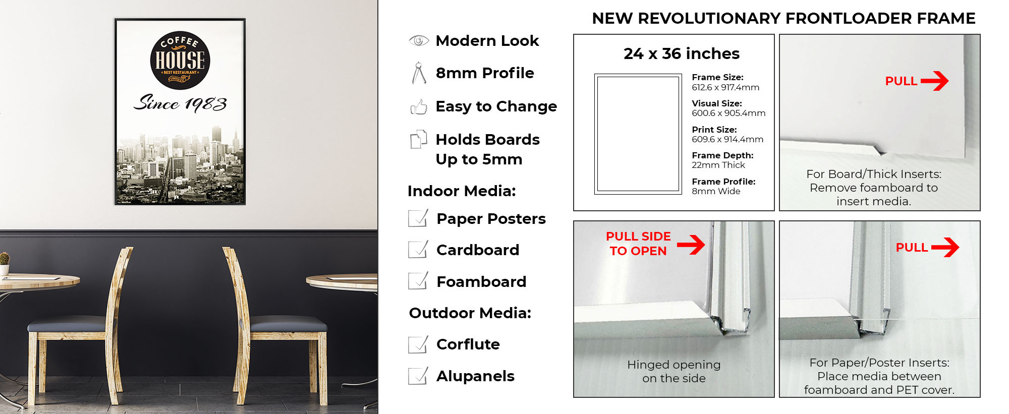 Make your posters stand out with the Front Loader Poster Frame. Designed for simplicity and style, this sign frame features a sleek finish and a convenient side-loading design. Simply open the frame from the side, insert your paper, corflute or any signage up to 5mm thick and close it back up, no tools required. Ideal for various indoor and outdoor environments including retail stores, corporate offices, healthcare facilities, and more, this frame is perfect for displaying posters, advertisements, graphics, photography, and other signage with ease and aesthetic appeal.