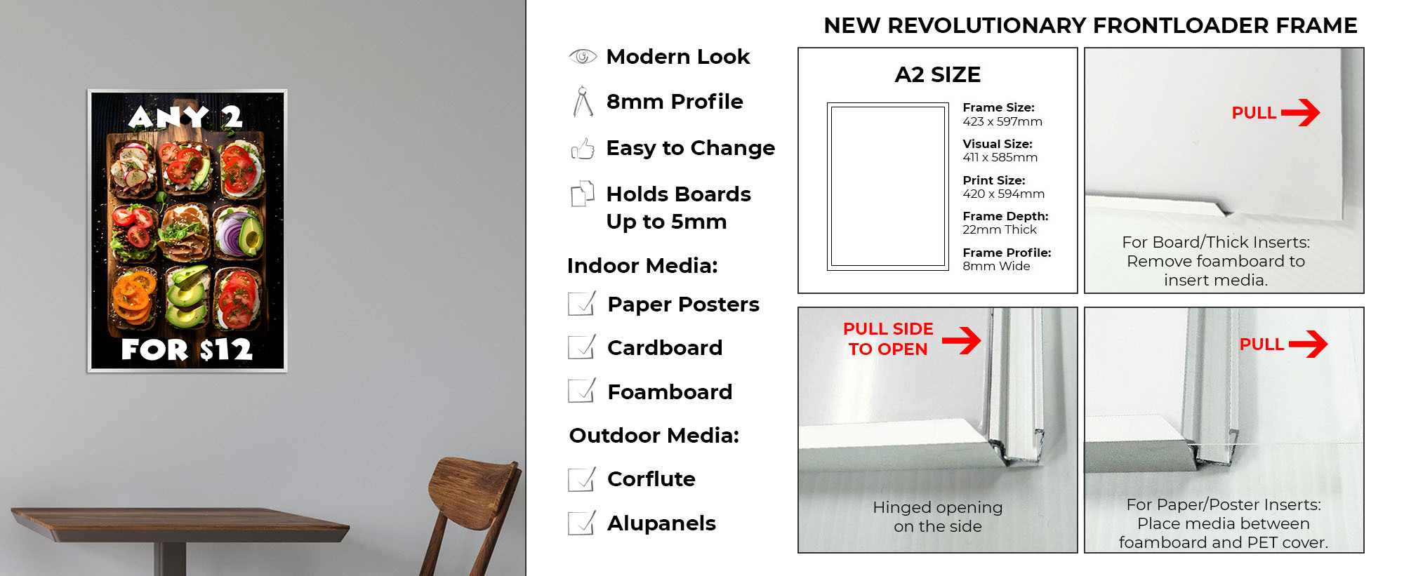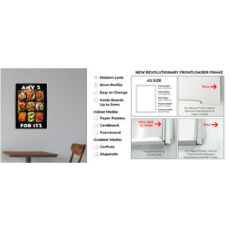 Make your posters stand out with the Front Loader Poster Frame. Designed for simplicity and style, this sign frame features a sleek finish and a convenient side-loading design. Simply open the frame from the side, insert your paper, corflute or any signage up to 5mm thick and close it back up, no tools required. Ideal for various indoor and outdoor environments including retail stores, corporate offices, healthcare facilities, and more, this frame is perfect for displaying posters, advertisements, graphics, photography, and other signage with ease and aesthetic appeal.