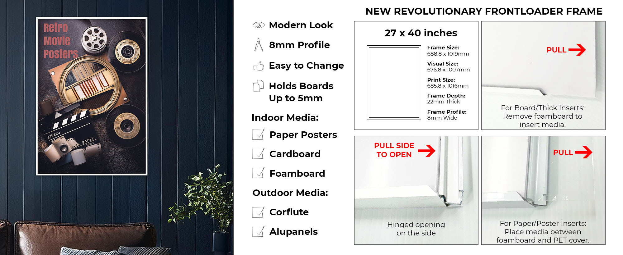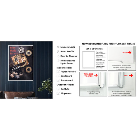 Make your posters stand out with the Front Loader Poster Frame. Designed for simplicity and style, this sign frame features a sleek finish and a convenient side-loading design. Simply open the frame from the side, insert your paper, corflute or any signage up to 5mm thick and close it back up, no tools required. Ideal for various indoor and outdoor environments including retail stores, corporate offices, healthcare facilities, and more, this frame is perfect for displaying posters, advertisements, graphics, photography, and other signage with ease and aesthetic appeal.