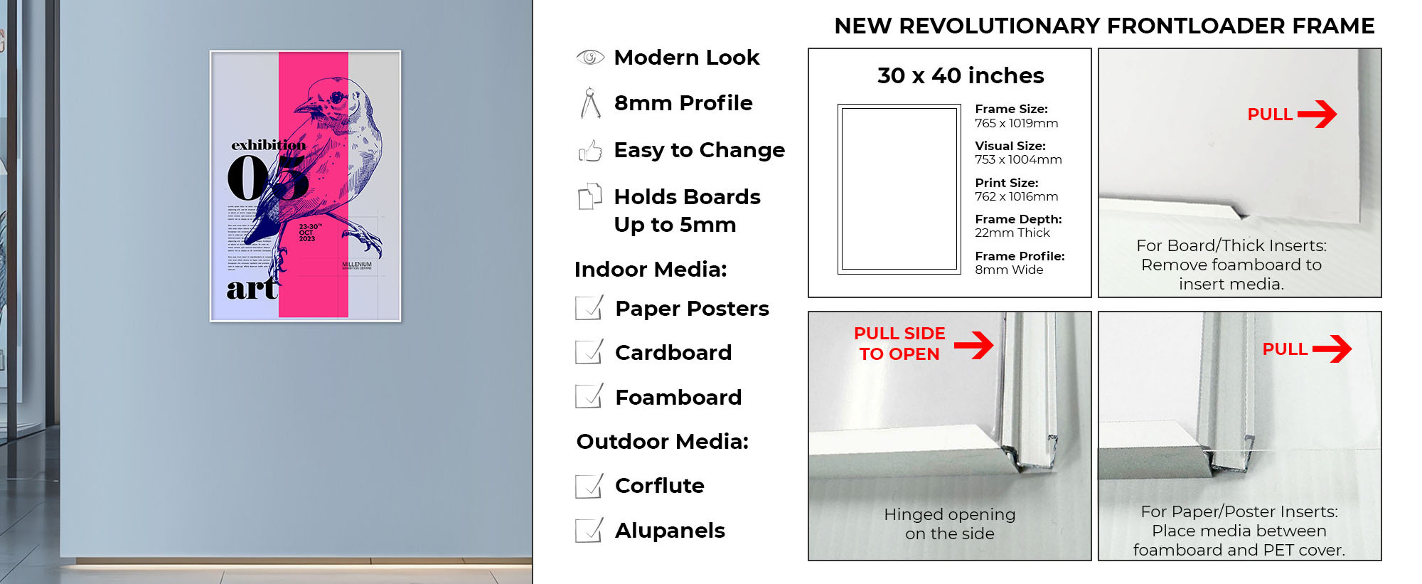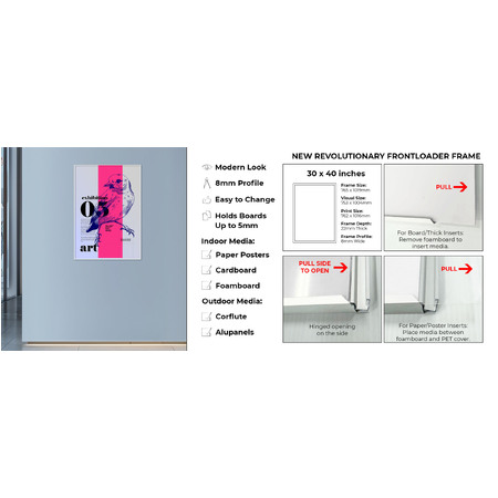 Make your posters stand out with the Front Loader Poster Frame. Designed for simplicity and style, this sign frame features a sleek finish and a convenient side-loading design. Simply open the frame from the side, insert your paper, corflute or any signage up to 5mm thick and close it back up, no tools required. Ideal for various indoor and outdoor environments including retail stores, corporate offices, healthcare facilities, and more, this frame is perfect for displaying posters, advertisements, graphics, photography, and other signage with ease and aesthetic appeal.
