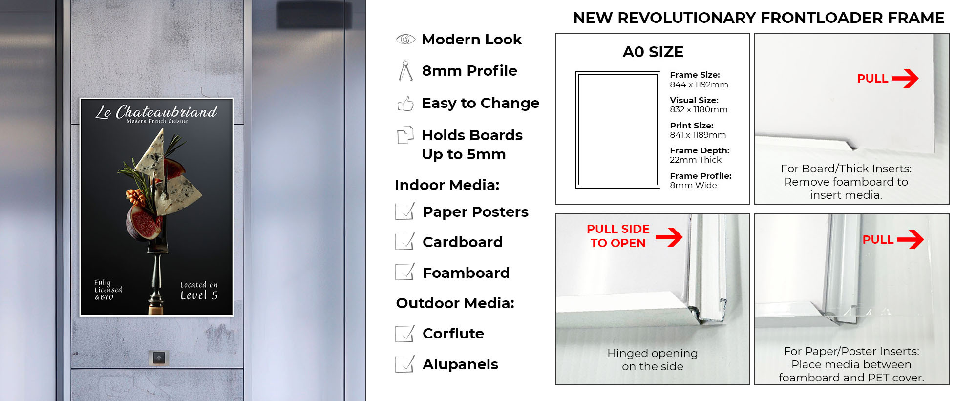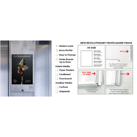 Make your posters stand out with the Front Loader Poster Frame. Designed for simplicity and style, this sign frame features a sleek finish and a convenient side-loading design. Simply open the frame from the side, insert your paper, corflute or any signage up to 5mm thick and close it back up, no tools required. Ideal for various indoor and outdoor environments including retail stores, corporate offices, healthcare facilities, and more, this frame is perfect for displaying posters, advertisements, graphics, photography, and other signage with ease and aesthetic appeal.