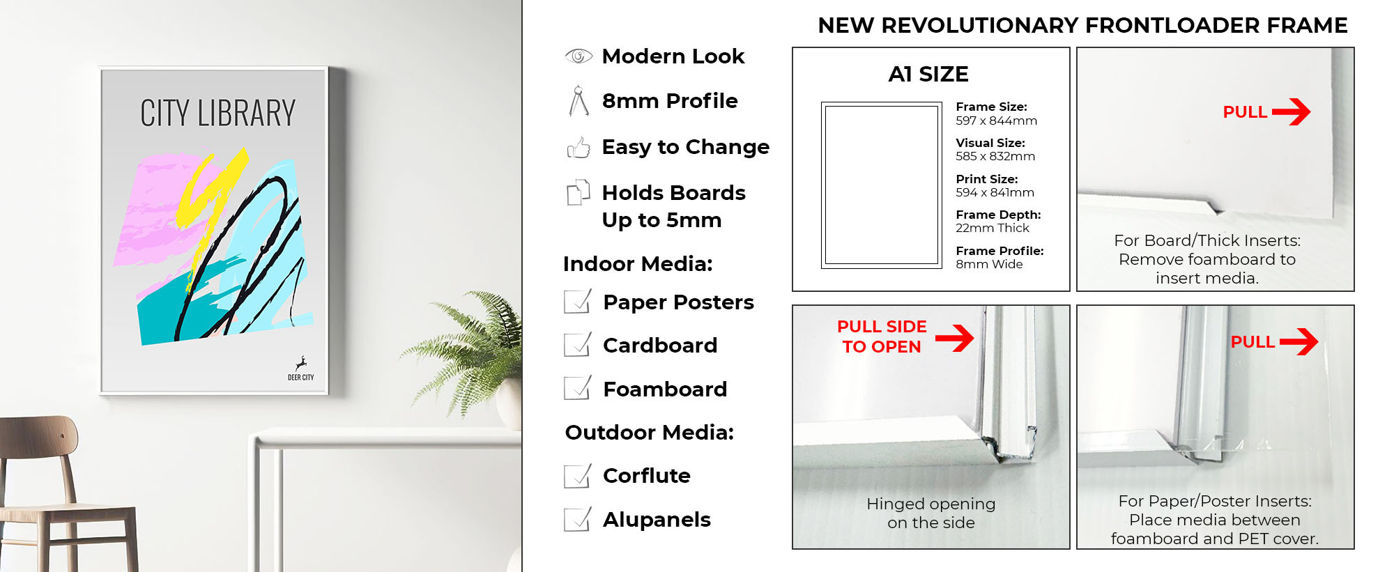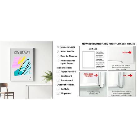 Make your posters stand out with the Front Loader Poster Frame. Designed for simplicity and style, this sign frame features a sleek finish and a convenient side-loading design. Simply open the frame from the side, insert your paper, corflute or any signage up to 5mm thick and close it back up, no tools required. Ideal for various indoor and outdoor environments including retail stores, corporate offices, healthcare facilities, and more, this frame is perfect for displaying posters, advertisements, graphics, photography, and other signage with ease and aesthetic appeal.