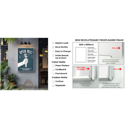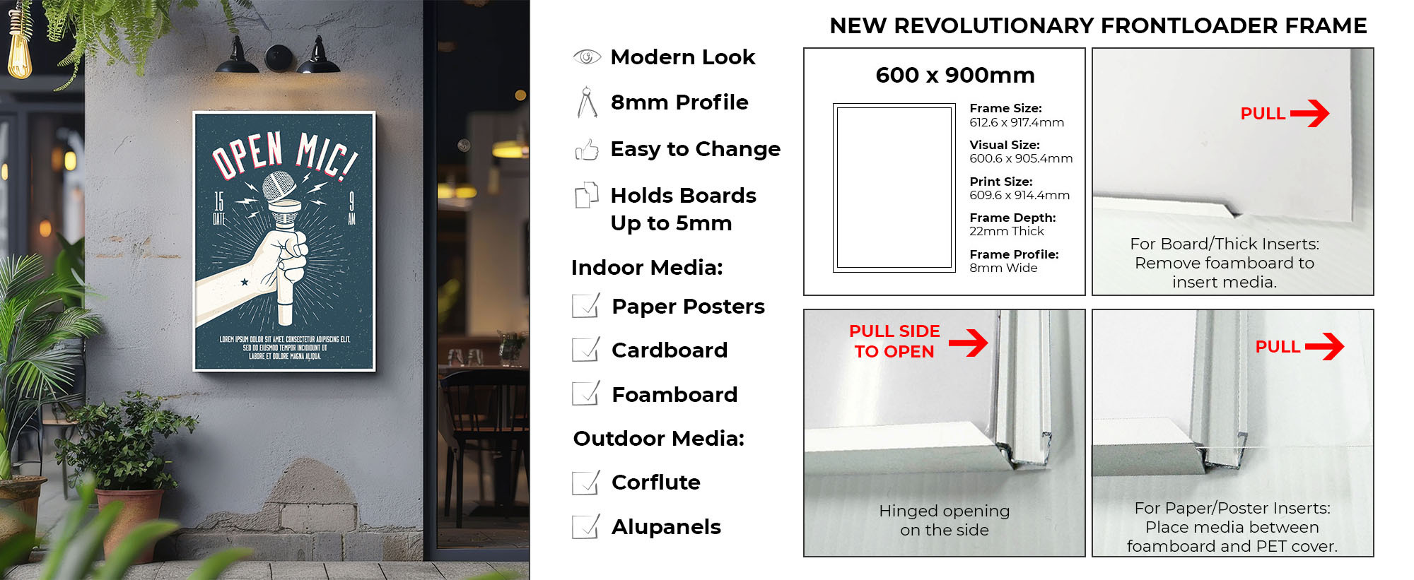 Make your posters stand out with the Front Loader Poster Frame. Designed for simplicity and style, this sign frame features a sleek finish and a convenient side-loading design. Simply open the frame from the side, insert your paper, corflute or any signage up to 5mm thick and close it back up, no tools required. Ideal for various indoor and outdoor environments including retail stores, corporate offices, healthcare facilities, and more, this frame is perfect for displaying posters, advertisements, graphics, photography, and other signage with ease and aesthetic appeal.